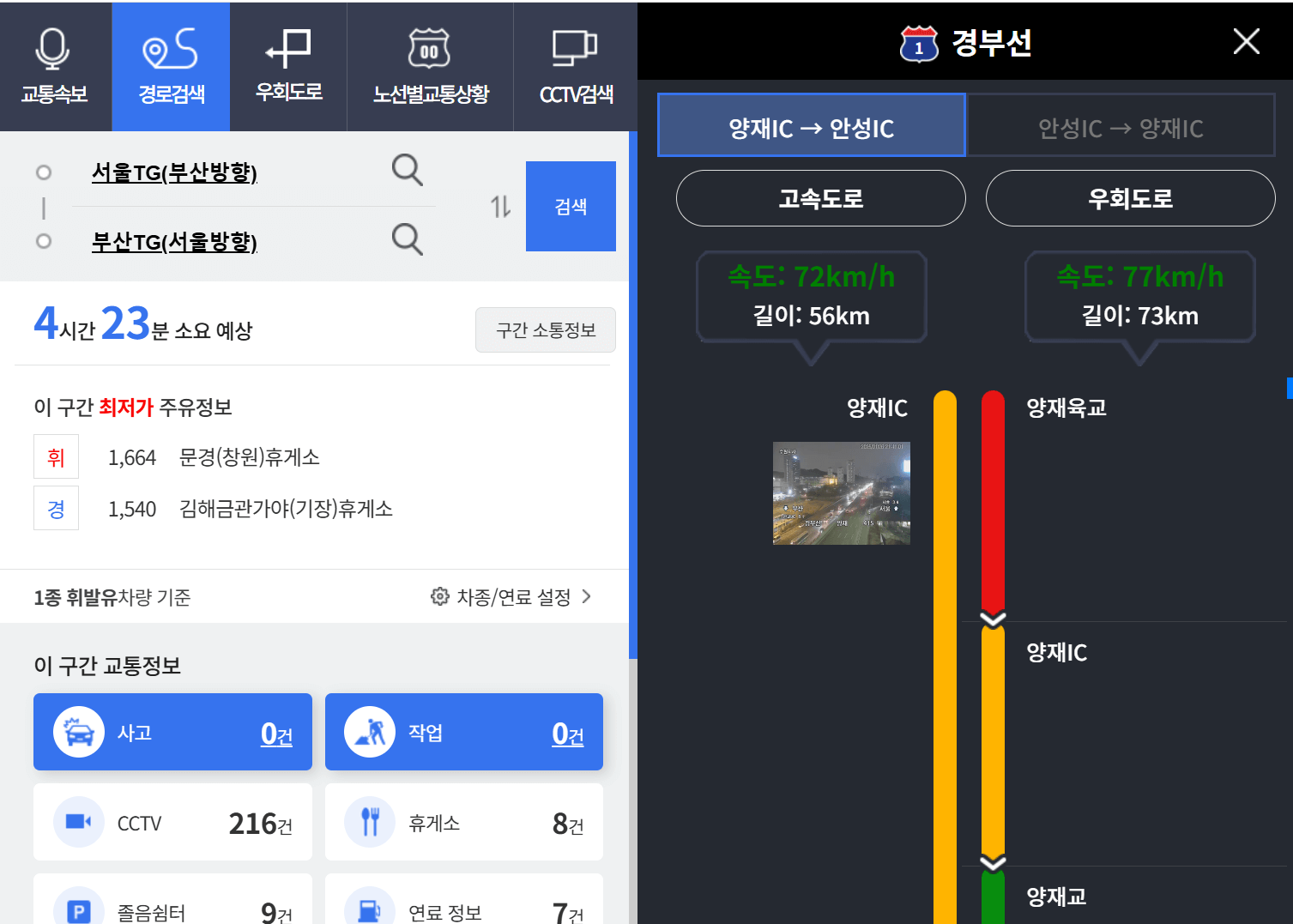 주요 도로와 고속도로의 실시간 CCTV 영상을 확인할 수 있어 도로 상태를 한눈에 파악할 수 있습니다.